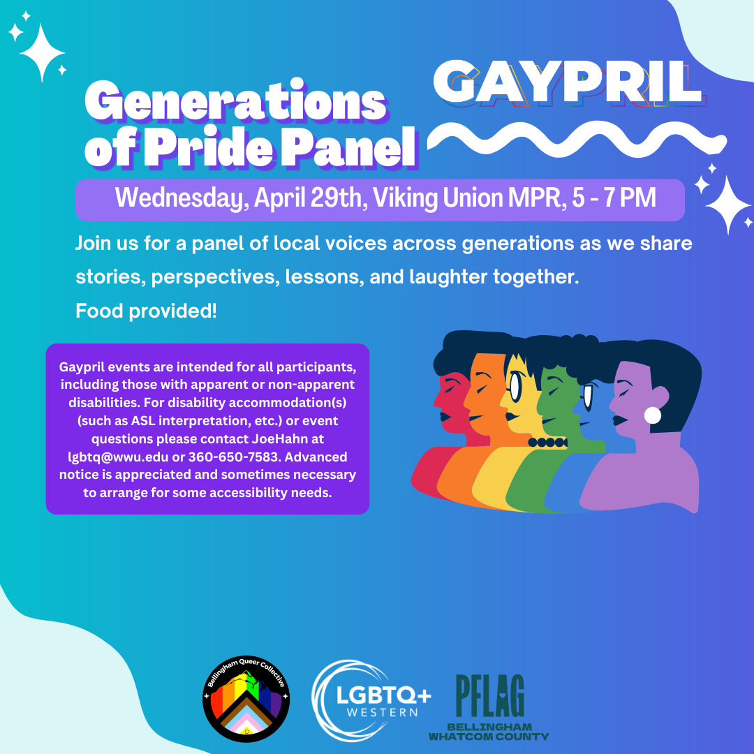 This month we are honoring the 2026 Gaypril event at WWU that inspired this program to be created! After we eat, we will revisit why intergenerational queer connections are needed and wanted by our community, and hear from a panel of speakers across many generations.