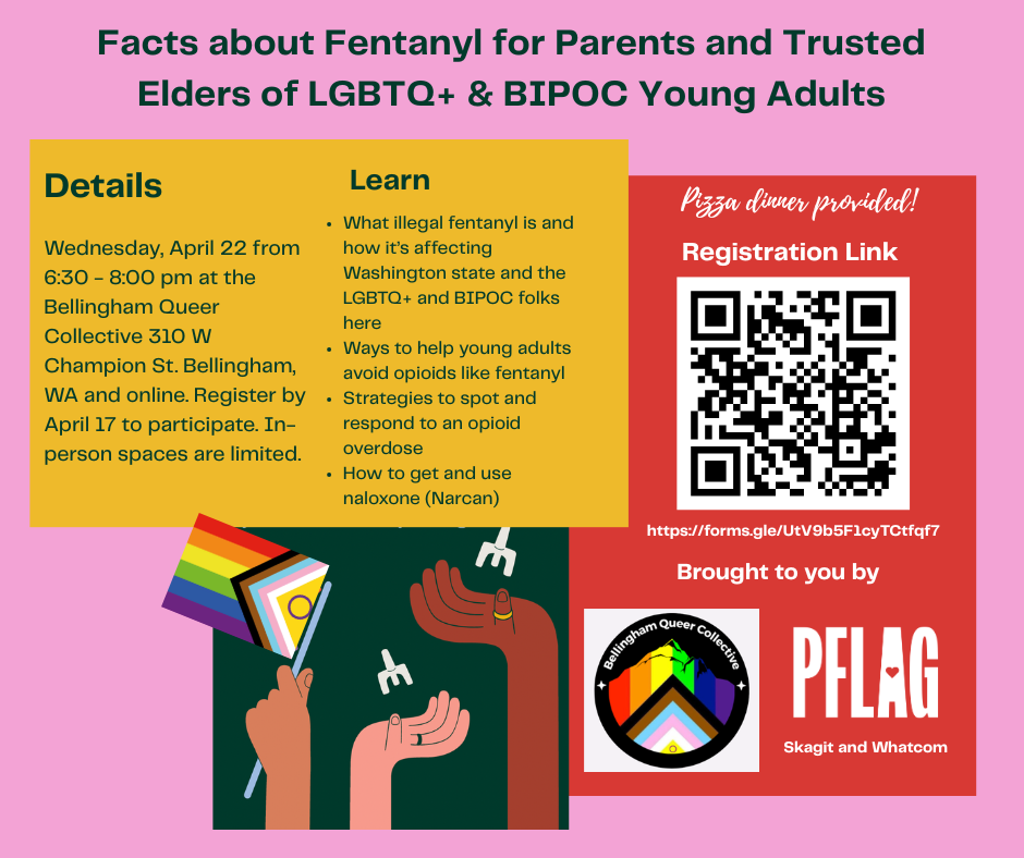 Join us on Wednesday, April 22 from 6:30 - 8:00 pm at the Bellingham Queer Collective, 310 W Champion St. In person space is limited to 15 people and others may join online via Zoom. Pizza dinner will be provided. Sign up is required to reserve an in person space and to get a Zoom link. To participate, please register by April 17.