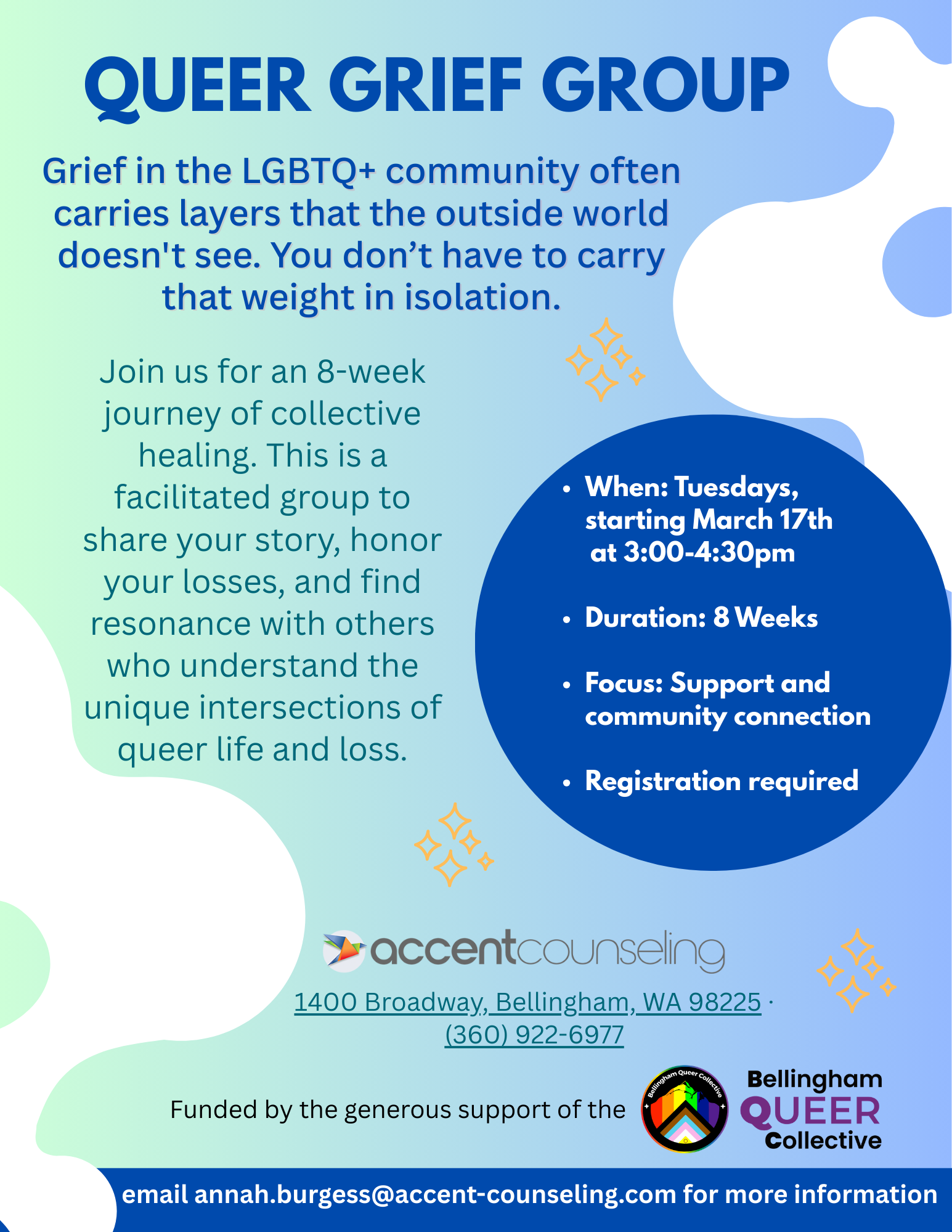 The BQC is excited to continue our partnership with Accent Counseling to provide our community with another grief support group based on the needs expressed to us by our members. This will be the third opportunity for you to join a group at no cost to you thanks to a generous grant from the Mount Baker Foundation. Support groups are typically not covered by insurance but we know that they provide critical support for healing and processing.
