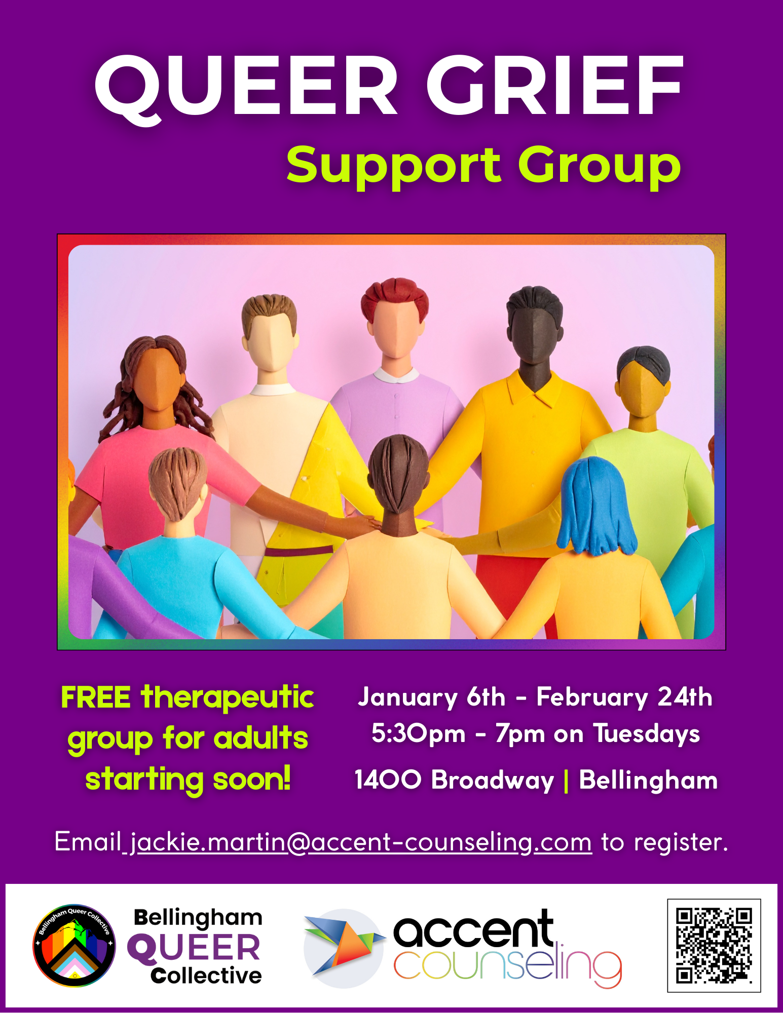 The BQC is thrilled to be partnering again with our friends at Accent Counseling to provide another FREE counseling support group designed specifically for our queer community! Thanks to your donations to the BQC and grants we were recently awarded, there is no cost to participants. Support groups are typically not covered by insurance but we know that they provide critical support for healing and processing.